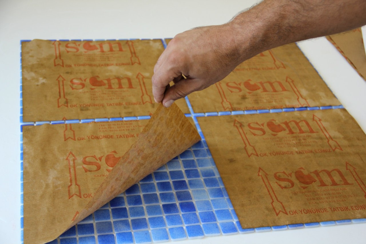 Бумага нанесена на лицевую поверхность мозаики и укладка такой мозаики отличается от укладки мозаики на сетке и плитки.